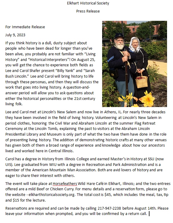 Historical interpreters, Lee & Carol Shafer, "Billy Yank" & "Sarah Bush